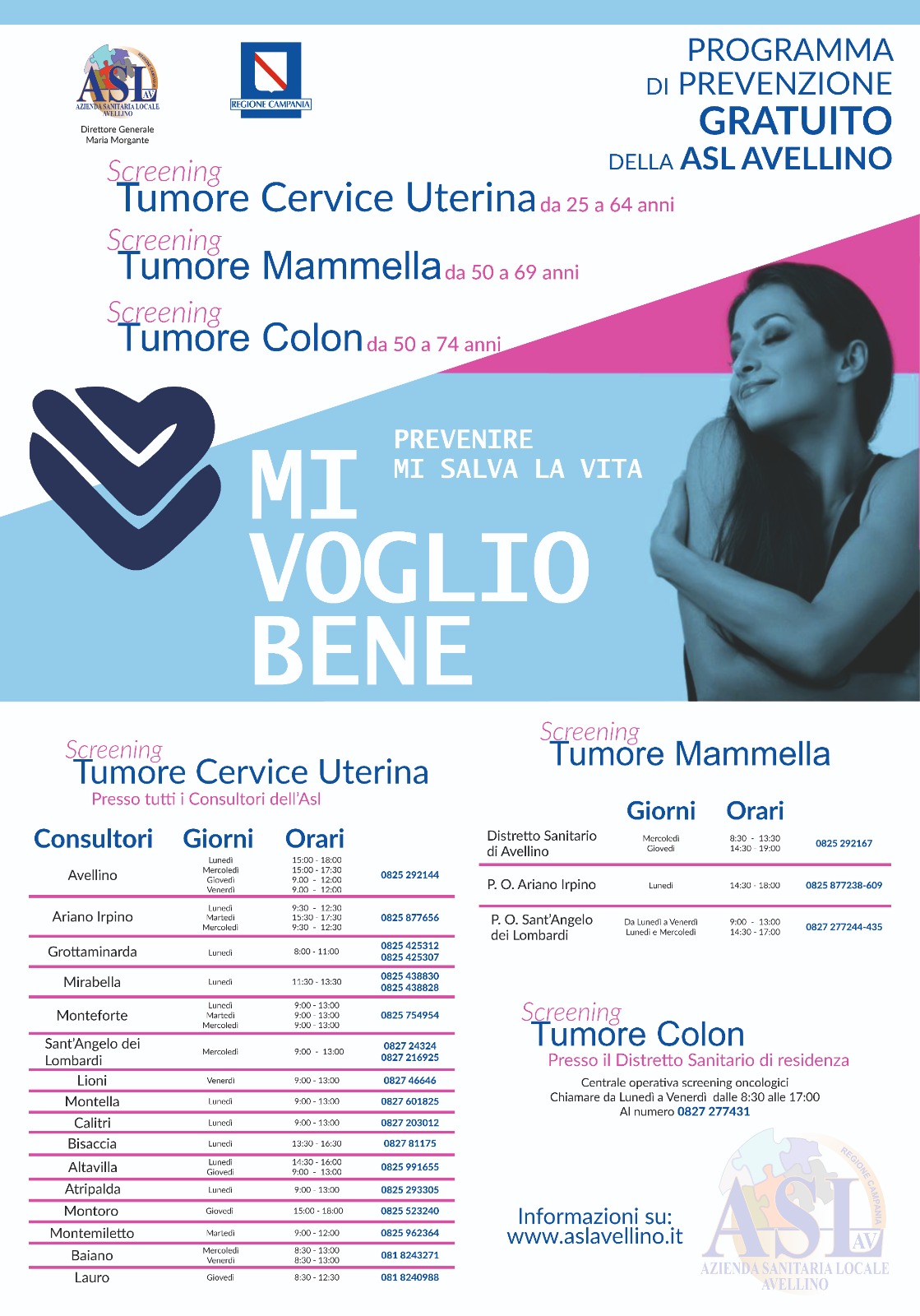 Per aderire gratuitamente allo Screening della Mammella, rivolto alle donne nella fascia di età 50-69 anni, è possibile rivolgersi al Distretto Sanitario di Avellino, al Presidio Ospedaliero “Frangipane” di Ariano Irpino e al Presidio Ospedaliero “Criscuoli” di Sant’Angelo dei Lombardi ed effettuare gratuitamente la Mammografia, sia spontaneamente che attraverso lettera di invito della ASL.
