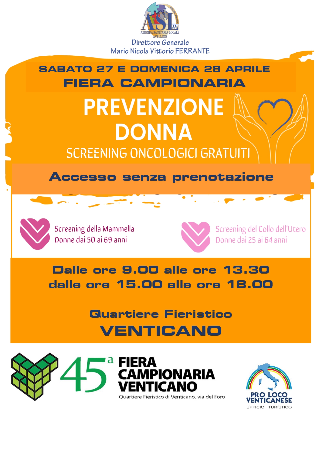 Nell'ambito del Programma di Screening oncologici i Camper della Salute dell'ASL di Avellino saranno presenti presso il Quartiere Fieristico di Venticano in occasione della Fiera Campionaria per lo screening della Mammella e della Collo dell’utero (o Cervice uterina) Sabato 27 e Domenica 28 aprile dalle ore 9.00 alle ore 13.30 e dalle ore 15.00 alle ore 18.00.