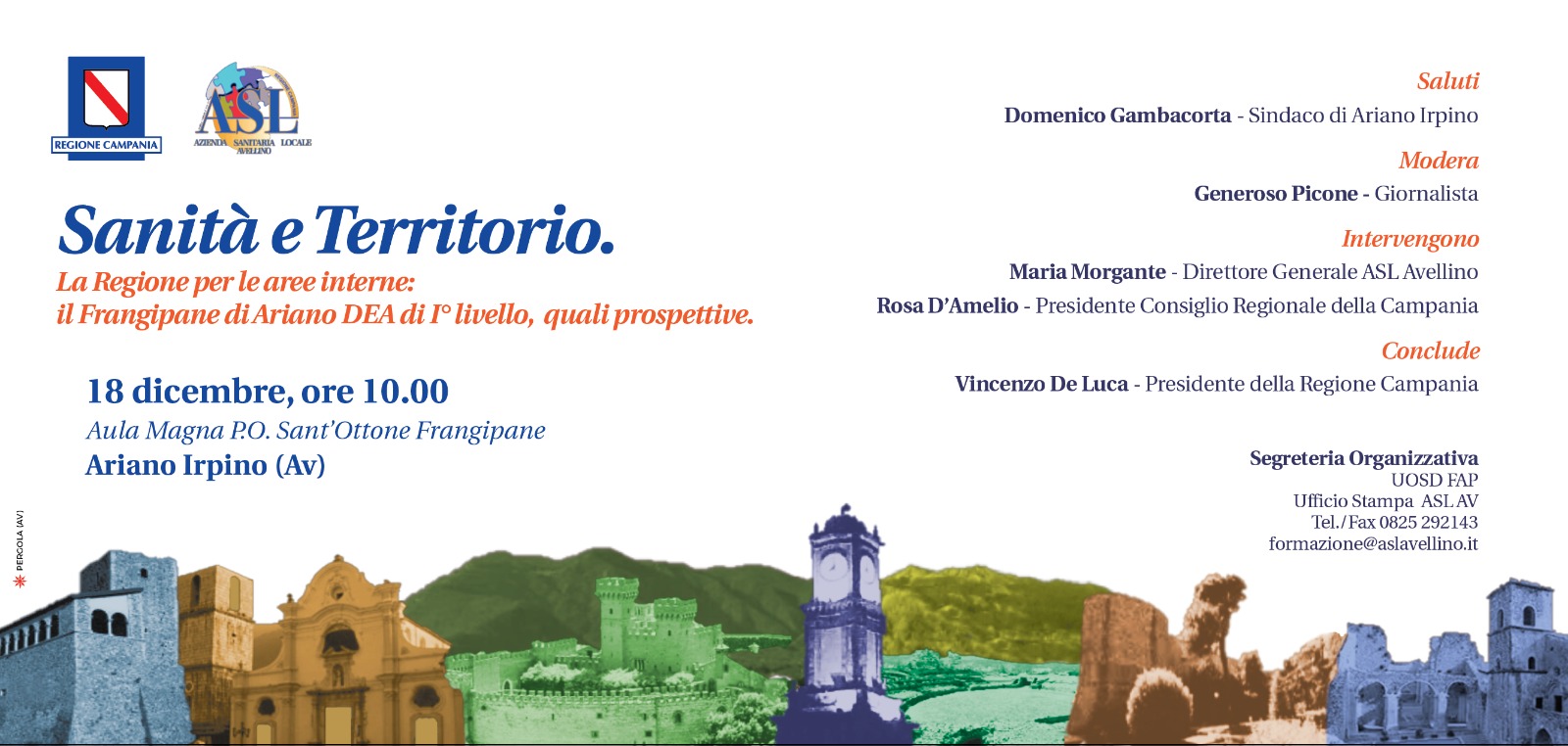 Si terrà martedì 18 dicembre 2018 alle ore 10 presso l'Aula Magna del P.O. “Sant'Ottone Frangipane” di Ariano Irpino il Convegno dedicato a “Sanità e territorio. La Regione per le aree interne: il Frangipane di Ariano DEA di I livello, quali prospettive”