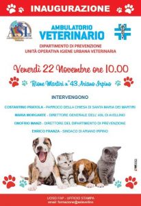 Si terrà venerdì 22 novembre 2019 alle ore 10 in Rione Martiri n. 43 ad Ariano Irpino l’inaugurazione del nuovo ambulatorio veterinario dell’Asl di Ariano Irpino, alla presenza del parroco della Chiesa di Santa Maria dei Martiri, Costantino Pratola, del Direttore Generale dell’Asl di Avellino, Maria Morgante, del Direttore del Dipartimento di prevenzione, Onofrio Manzi e del Sindaco di Ariano Irpino, Enrico Franza.