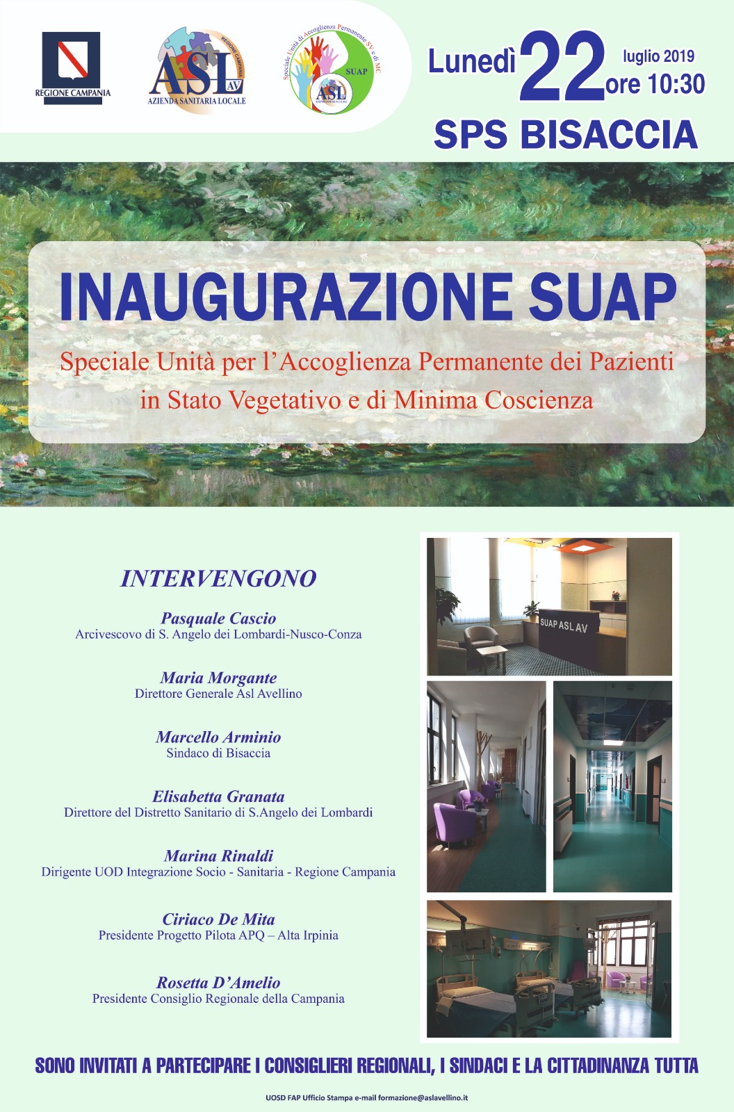 Si terrà lunedì 22 luglio alle ore 10.30 presso l’SPS di Bisaccia l’inaugurazione della SUAP, Speciale Unità per l’Accoglienza Permanente (SUAP) dei Pazienti in Stato Vegetativo (SV) e di Minima Coscienza (SMC), dotata di 10 posti letto.