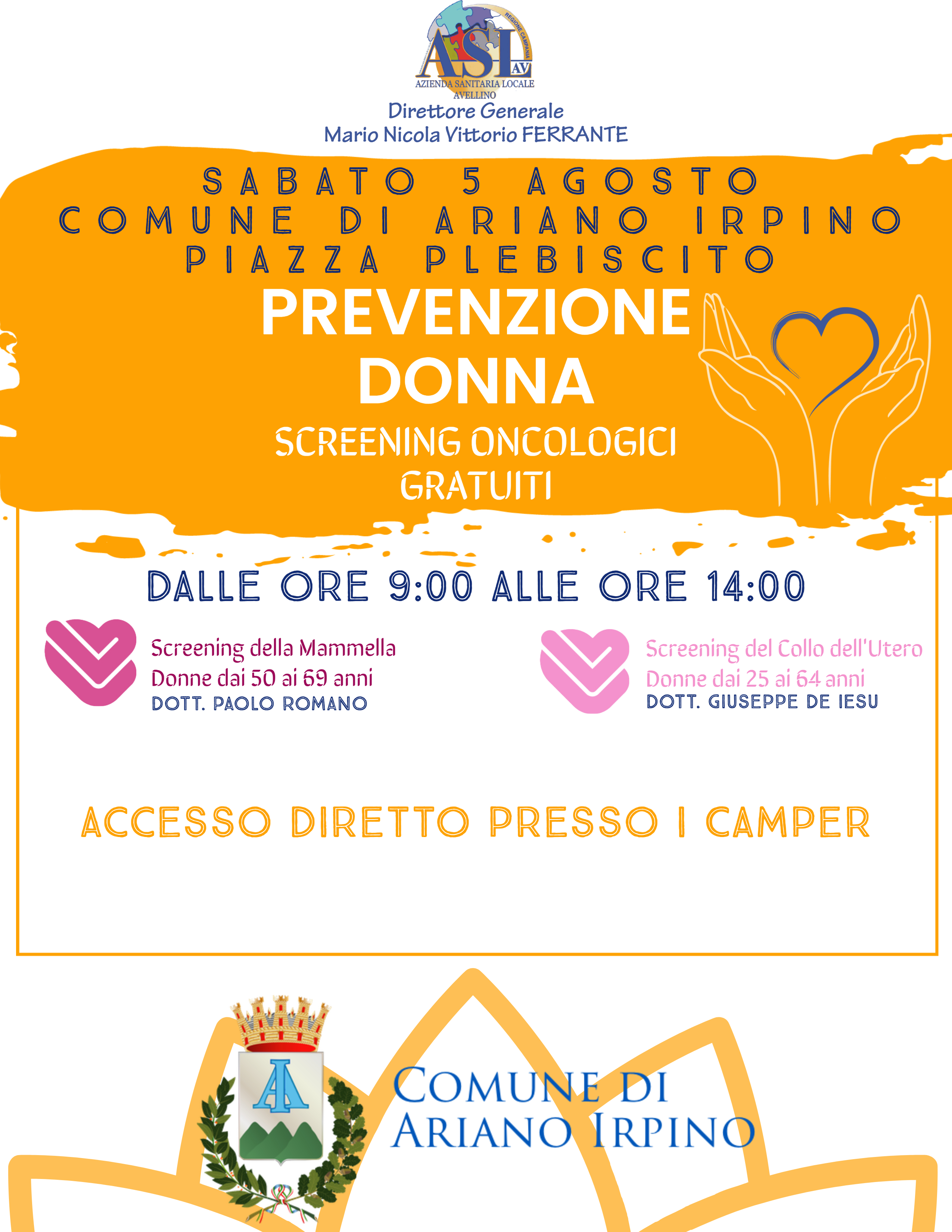 Sabato 5 agosto le unità mobili dell’ASL faranno tappa in Piazza Plebiscito ad Ariano Irpino. Dalle ore 9.00 alle ore 14.00 sarà possibile aderire allo screening gratuito della mammella, per le donne dai 50 ai 69 anni, e del collo dell’utero, per le donne dai 25 ai 64 anni, senza prenotazione con accesso diretto ai Camper dell'ASL.