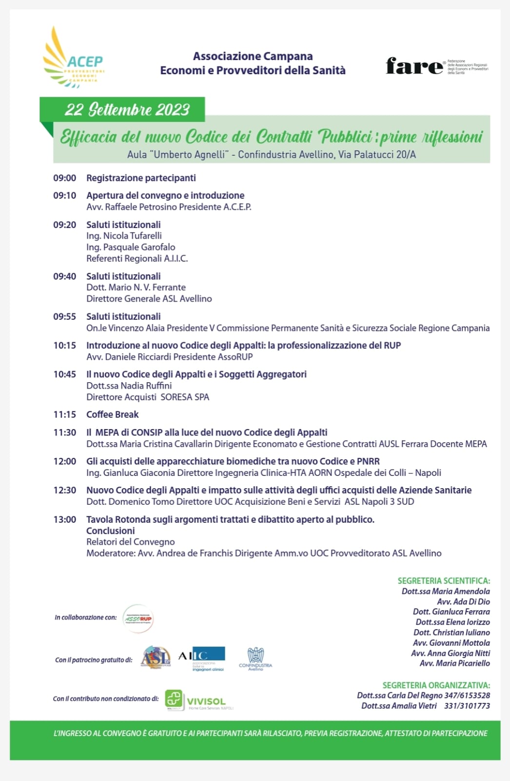 All’evento parteciperanno tra gli altri: Avv. Raffaele Petrosino, Presidente A.C.E.P., Ing. Nicola Tufarelli e Ing. Pasquale Garofalo, Referenti Regionali A.I.I.C., Dott. Mario N. V. Ferrante, Direttore Generale ASL Avellino, On.le Vincenzo Alaia, Presidente V Commissione Permanente Sanità e Sicurezza Sociale Regione Campania, Avv. Daniele Ricciardi, Presidente AssoRUP, Dott.ssa Nadia Ruffini, Direttore Acquisti SORESA SPA, Dott.ssa Maria Cristina Cavallarin, Dirigente Economato e Gestione Contratti AUSL Ferrara Docente MEPA, Ing. Gianluca Giaconia, Direttore Ingegneria Clinica-HTA AORN Ospedale dei Colli – Napoli, Dott. Domenico Tomo, Direttore UOC Acquisizione Beni e Servizi ASL Napoli 3 SUD.