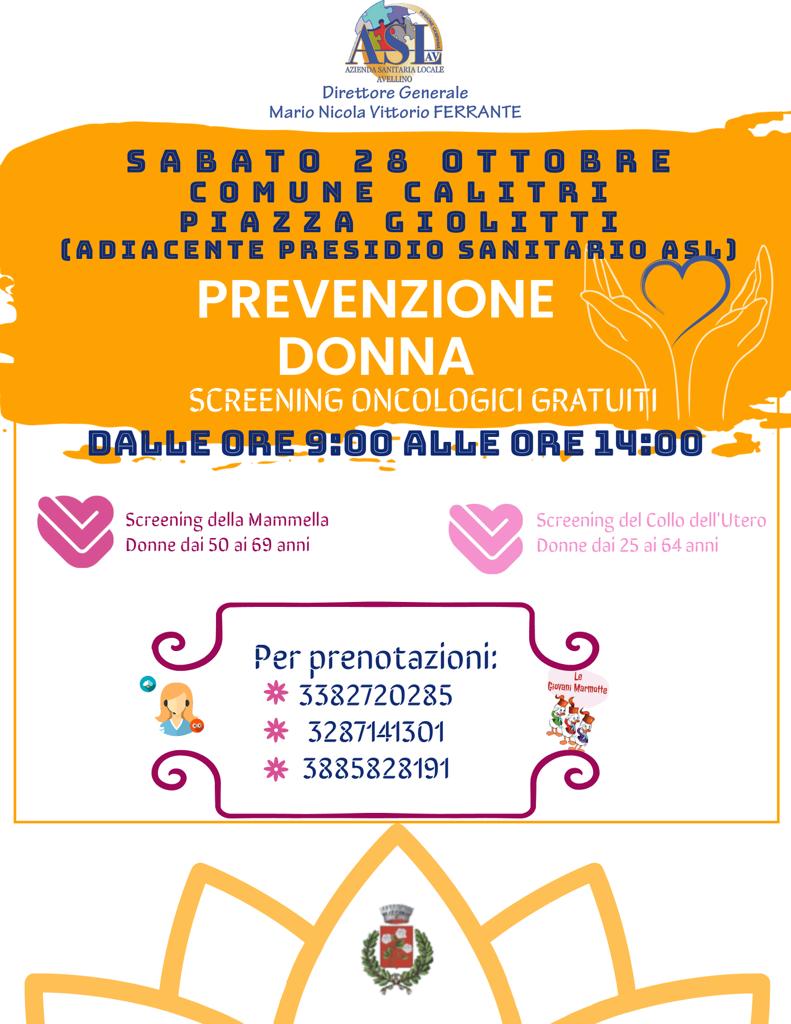 Sabato 28 ottobre le unità mobili dell’ASL faranno tappa nel Comune di Calitri in Piazzale Giolitti (Area attigua al Presidio Sanitario ASL) in occasione VIII Memorial “Fiammetta Acquaviva”. Dalle ore 9.00 alle ore 14.00 sarà possibile aderire allo screening gratuito della mammella (per le donne dai 50 ai 69 anni) e del collo dell'utero (per le donne dai 25 ai 64 anni).