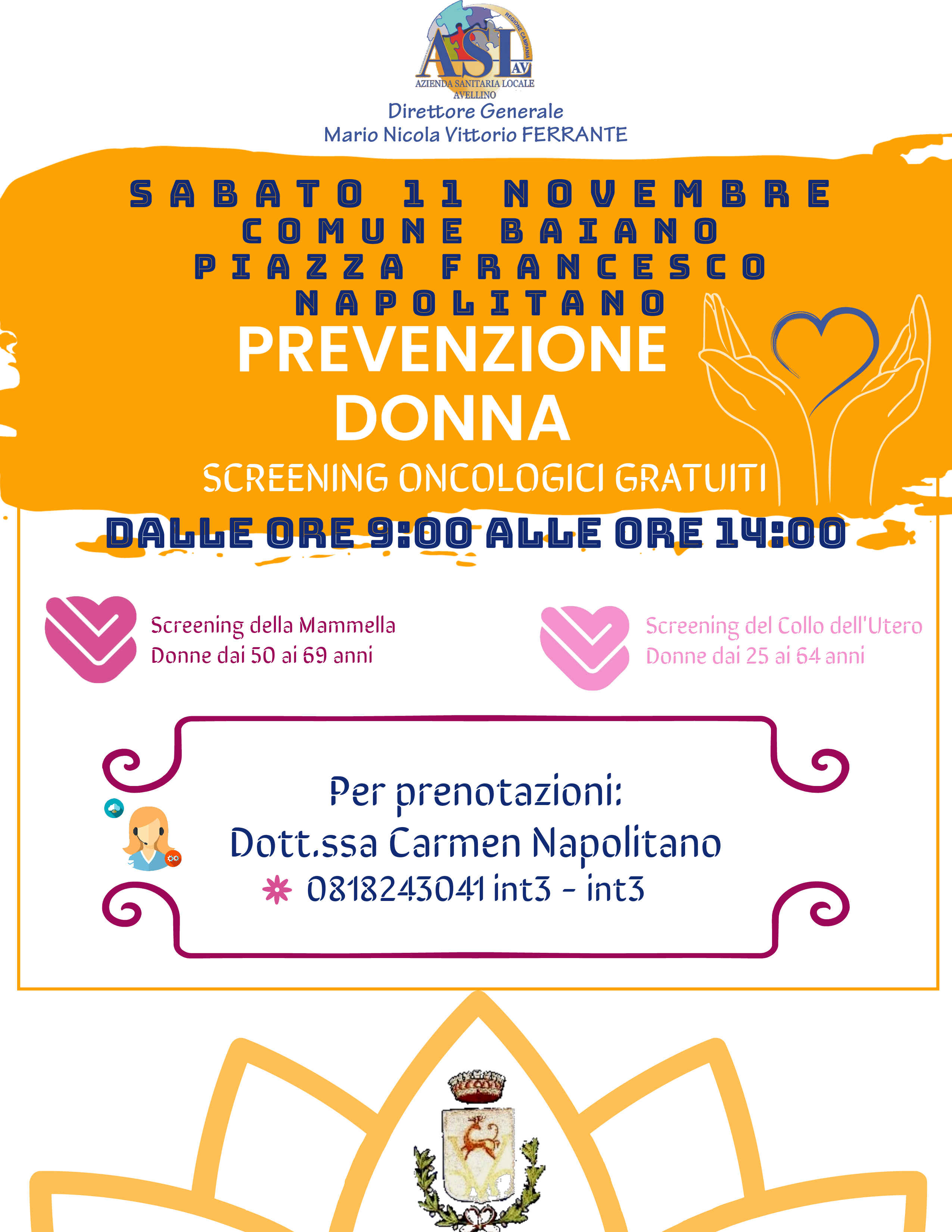 Sabato 11 novembre le unità mobili dell’ASL dalle ore 9.00 alle ore 14.00 faranno tappa nel Comune di Baiano in Piazza Francesco Napolitano. Per prenotazioni rivolgersi al numero tel. 0818243041 (int.3-int.3 Dott.ssa Carmen Napolitano)
