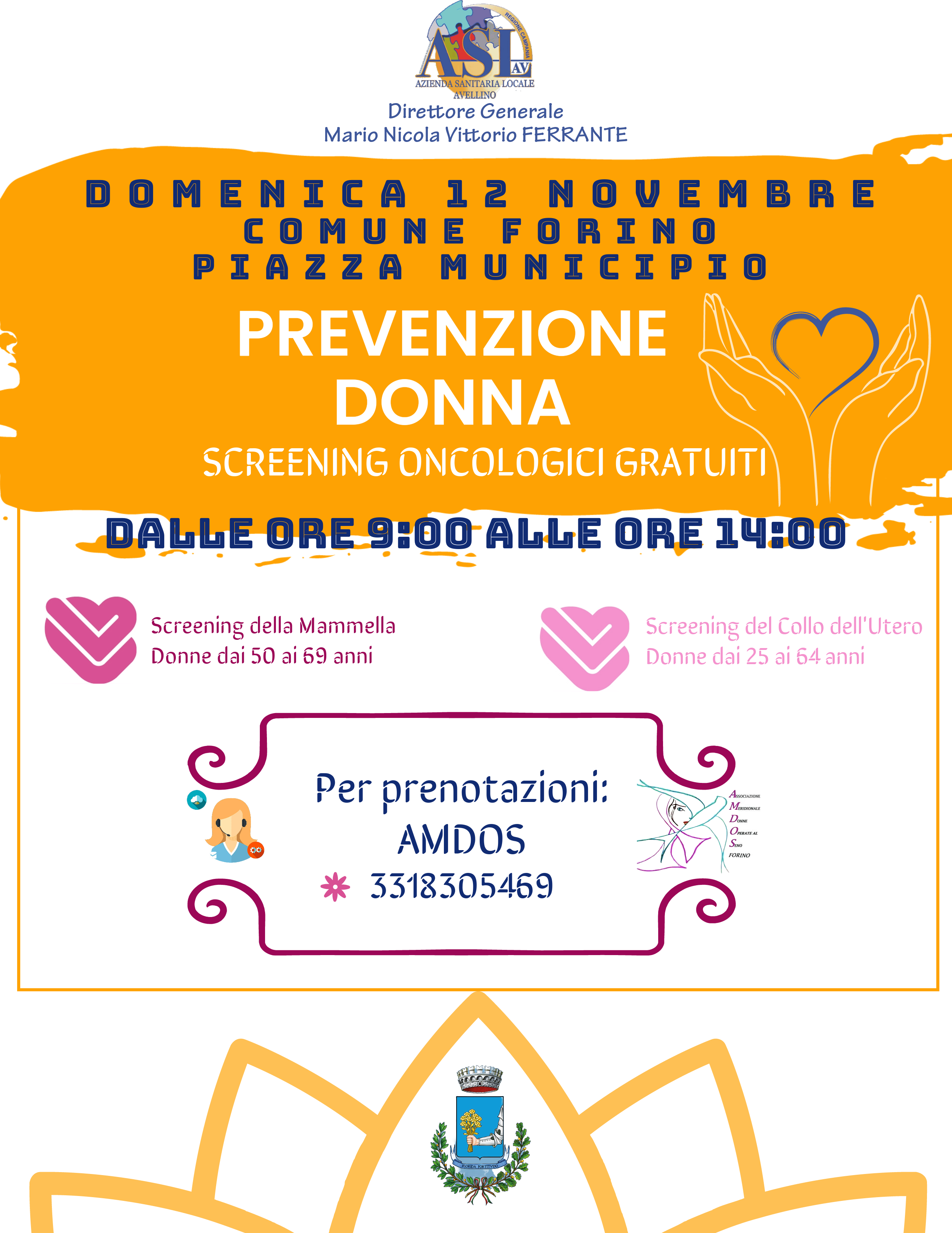 Domenica 12 novembre le unità mobili dell’ASL dalle ore 9.00 alle ore 14.00 faranno tappa nel Comune di Forino in Piazza Municipio. Per prenotazioni rivolgersi al numero tel. 3318305469 (Amdos Forino)