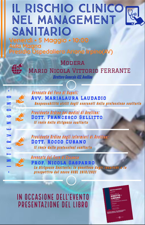 Venerdì 5 maggio presso l'Aula Magna del P.O. di Ariano Irpino vi sarà un meeting sul Rischio Clinico nel Management Sanitario.